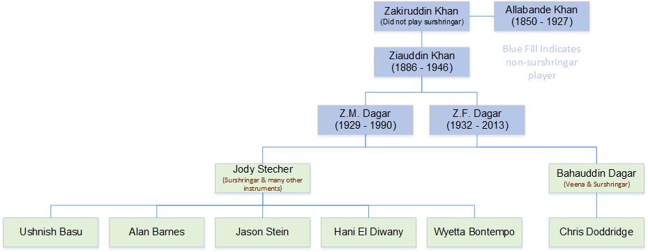 At the current time, there are only 16 surshringar players in the world today. Here’s a tree for each of their lineages. Note that teachers who were not surshringar players are in documented blue. Most surshringar players also played sarod. Some also played other instruments.
